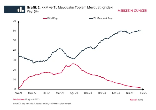 2️⃣ TCMB, Kur Korumalı Mevduat’ta son pencereyi de kapattı. 23 Ağustos itibarıyla gerçek kişiler için de yeni açılış ve yenileme işlemleri durduruldu. TCMB’nin 2025 Para Politikası Metni’nde işaret edilen bu hedef, kademeli adımlarla zaten ilerliyordu. Önce tüzel kişi hesapları kapatıldı, ardından zorunlu karşılıklar, faiz düzenlemeleri ve stopaj avantajının kaldırılmasıyla TL mevduat cazip hale getirildi. İki yıl boyunca ekonominin merkezinde yer alan KKM, 2023 ortasında 140 milyar doların üzerine çıkmıştı. Fakat sıkı para politikası ve makroihtiyati tedbirlerle birlikte hızla eridi. 2025 başında 32,5 milyar dolara inen bakiye, bugün 11 milyar dolara kadar geriledi. Bankaların TL fonlamayı tercih etmeleri için zorunlu karşılık farkları ve faiz ödemeleri kullanıldı. Dövizdeki oynaklığın azalması ve TL lehine açılan getiri makası da mudilerin yönelimini değiştirdi. KKM’nin kaldırılması, sadece bir ürünün sonlanması açısından önemli değil. Para politikasının aktarım mekanizmasının güçlenmesi, TCMB bilançosundaki kur riski yükünün azalması ve makroihtiyati çerçevenin sadeleşmesi anlamına geliyor.