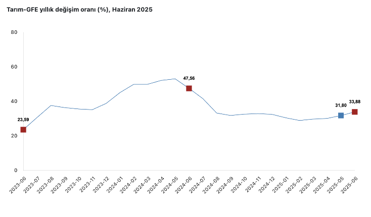 1️⃣ Türkiye’de gıda fiyatlarının seyri, enflasyonun gidişatı açısından oldukça önemli. TÜFE’nin kabaca dörtte birini oluşturan gıda fiyatları, dezenflasyon sürecinde en çok izlediğimiz yerlerden biri. TÜİK’in açıkladığı Tarım Girdi Fiyat Endeksi, çiftçinin üretimini gerçekleştirmek için ara tüketim olarak kullandığı mal ve hizmetler ile yatırım amaçlı aldığı mal ve hizmetlerin ortalama fiyatlarındaki değişimi ölçmek amacıyla hesaplanan bir endeks. Bu hafta gelen veriler, maliyet baskısının sürdüğüne işaret ediyor. Haziran ayında Tarım-GFE aylık bazda yüzde 2,52 arttı, yıllık artış ise yüzde 33,9’a ulaştı. Yıl başına göre kümülatif artış yüzde 17,9 oldu. Aylık bazda gübre ve toprak geliştiriciler yüzde 6’dan fazla artarak zirvede yer aldı. Enerji, yağlayıcılar, tohum ve makine bakım giderleri de yukarı yönlü seyrini sürdürdü. Ana gruplara bakıldığında, tarımda kullanılan mal ve hizmetler endeksi yıllık yüzde 33,9 yükselirken, tarımsal yatırıma katkı sağlayan mal ve hizmetler endeksi de yüzde 33,6 arttı. Tarım Girdi Fiyat Endeksi, önümüzdeki dönemde gıda tarafında maliyet baskılarını hissetmeye devam edeceğimizi gösteriyor.