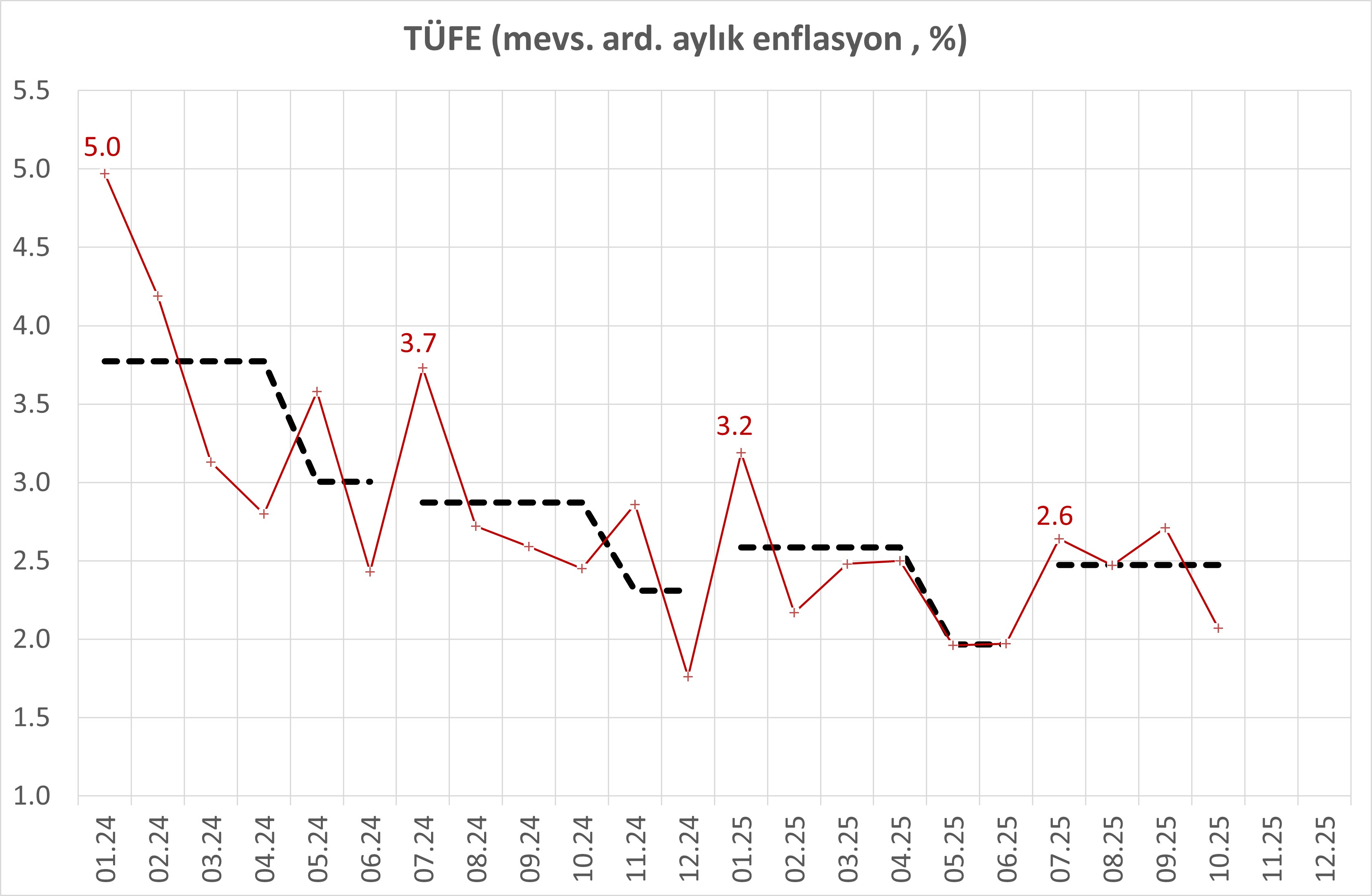 3️⃣ Akbank Ekonomik Araştırmalar’ın kasım enflasyonuna ilişkin çalışması, gıda kaynaklı belirgin bir iyileşmeye işaret ederken aylık enflasyonun medyanda %1,2, ortalamada %1,1 civarında gerçekleşeceğini ve yıllık enflasyonun yaklaşık 1,5 puan gerileyerek ekimdeki %32,9 seviyesinden aşağı ineceğini öngörüyor. Mevsimsellikten arındırılmış aylık enflasyonun doğrudan yaklaşımla %1,2 civarında, dolaylı yaklaşımla ise biraz daha yüksek olabileceği belirtilirken, bunun son yılların en düşük aylık eğilimlerinden biri olabileceği vurgulanıyor. Yıl sonu enflasyon tahminine (%32,0) sınırlı aşağı yönlü risk gören Akbank, bu iyileşmenin Aralık PPK toplantısında 150 baz puanlık indirim ihtimalini masada tuttuğunu açıkladı.
