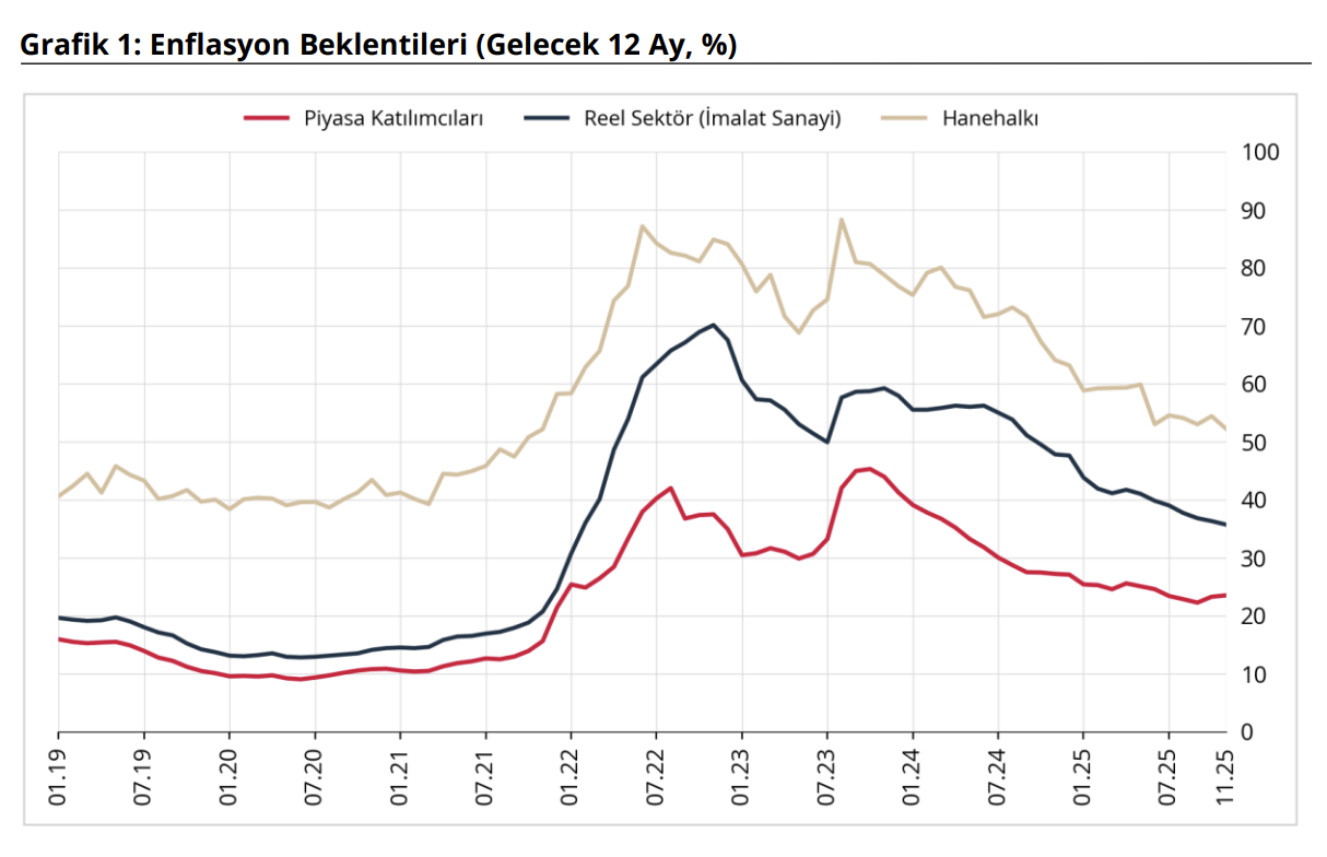 6️⃣ Kasım ayına ait Sektörel Enflasyon Beklentileri, piyasa katılımcıları, reel sektör ve hanehalkının gelecek 12 aya yönelik enflasyon tahminlerinde yön ayrışmalarına işaret etti. Piyasa katılımcılarının 12 ay sonrası yıllık enflasyon beklentisi aylık bazda 0,23 puan artarak %23,49’a yükselirken, reel sektörün beklentisi 0,60 puan düşüşle %35,70’e geriledi. Hanehalkının enflasyon beklentisi ise daha belirgin bir iyileşme göstererek 2,15 puan azaldı ve %52,24 seviyesine indi. Buna paralel olarak, gelecek 12 ayda enflasyonun düşeceğini bekleyen hanehalkı oranı da 1,67 puan azalarak %24,83’e geriledi. Geçen yılın aynı dönemine kıyasla tüm beklenti göstergelerindeki gerileme, genel dezenflasyon sürecine yönelik algının güçlendiğine işaret ediyor.