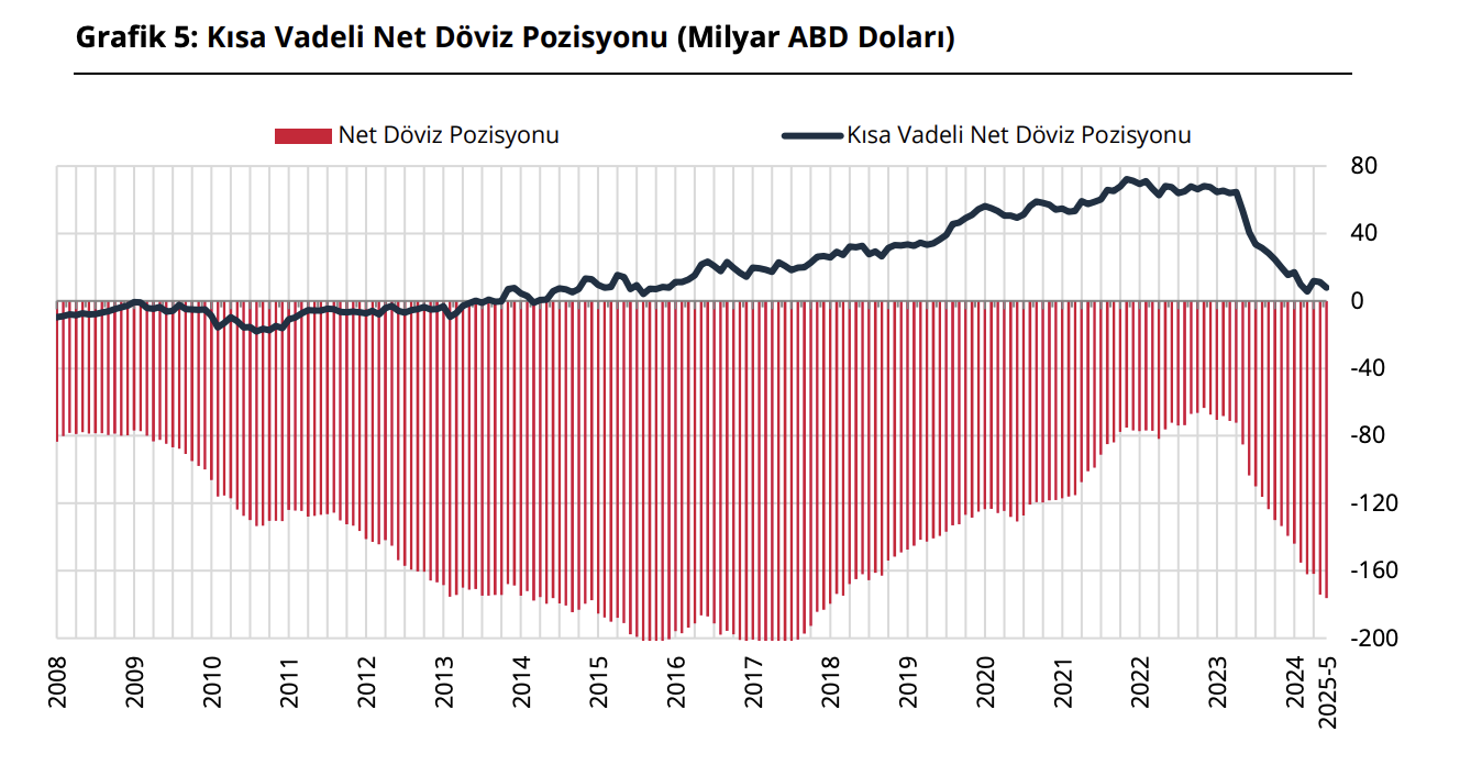 3️⃣ Reel sektörün döviz pozisyonuna ilişkin tablo, 2025 yılı itibarıyla risklerin yeniden büyüdüğüne işaret ediyor. Mayıs itibarıyla net döviz pozisyon açığı 176,2 milyar dolara yükselerek son 6,5 yılın en yüksek seviyesine ulaştı. Şirketlerin döviz varlıkları mayısta 1,3 milyar dolar artış gösterdi. Bu artışta, ihracat alacaklarındaki gecikmeli tahsilatlar, kur dalgalanmasına karşı artan hedge işlemleri ve TL faiz artışları nedeniyle döviz mevduatlarının çözülmesi etkili oldu. Ancak aynı dönemde yükümlülükler daha hızlı arttı. Toplamda 3,4 milyar dolarlık yükseliş yaşanırken, özellikle yurt dışı kısa vadeli kredilerde belirgin bir artış gözlendi. Bu artış, özellikle 2023 ortasından itibaren dövizle borçlanmaya dönüşün hızlandığını gösteriyor. TL’deki istikrarlı seyrin ve yüksek faiz ortamının, firmaları yeniden döviz cinsi borçlanmaya yönelttiği anlaşılıyor. Akıllara hemen 2018 gelse de reel sektörün bu açık dönemine daha hazırlıklı girdiğini söylemekte yarar var. Reel sektörün kısa vadeli döviz pozisyonu Mayıs 2025 itibariyle 7,9 milyar dolar fazla veriyor. Bu, firmaların kısa vadeli döviz yükümlülüklerini karşılayabilecek düzeyde nakit döviz varlığı tuttuğunu gösteriyor.
