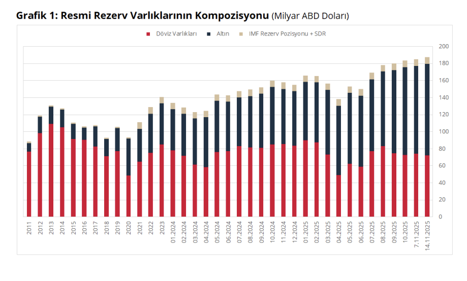 6️⃣ 14 Kasım haftasında yabancı yatırımcı ilgisinde belirgin bir ayrışma takip ettik. Yurt dışı yerleşikler hisse senetlerinde 158,8 milyon dolarlık net satış yaparken tahvil tarafında repo hariç 500 milyon dolarlık güçlü alım yaptı. Böylece yabancı alımları üst üste üçüncü haftaya taşınarak toplamda 1,2 milyar dolara ulaştı. Yılbaşından bu yana hisse senetlerine 1,4 milyar dolar, tahvillere ise 1,7 milyar dolar giriş dikkat çekerken, içeride döviz mevduatları tarafında hareket sınırlı kaldı. Altın hariç DTH’lar parite etkisinden arındırılmış olarak 46 milyon dolar artış kaydetti. Rezervlerde ise teknik bir ayrışma söz konusuydu. TCMB’nin net döviz rezervi haftalık bazda 1,1 milyar dolar gerileyerek 72 milyar dolara inerken, brüt rezervler 2,4 milyar dolar artarak 187,5 milyar dolara yükseldi. Swap stokunun düşmesiyle swap hariç net rezerv 57,6 milyar dolara geriledi.