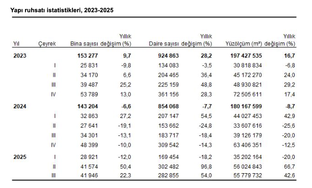8️⃣ İnşaat sektöründe öncü olarak takip ettiğimiz yapı ruhsatı verilerinde kayda değer bir canlanma görüyoruz. Yapı ruhsatı verilen binaların yüzölçümü yıllık bazda %42,6, daire sayısı ise %54 arttı. Kullanım amacına göre en yüksek payı 37,8 milyon m² ile iki ve daha fazla daireli konutlar alırken, sanayi binaları ve depolar ikinci sırada yer aldı. Benzer şekilde yapı kullanma izin belgelerinde de yüzölçümü yıllık %22,8 arttı. Kullanma izinlerinde de konut ağırlığı korunurken, iki ve daha fazla daireli binalar 21,5 milyon m² ile en büyük paya sahip oldu.