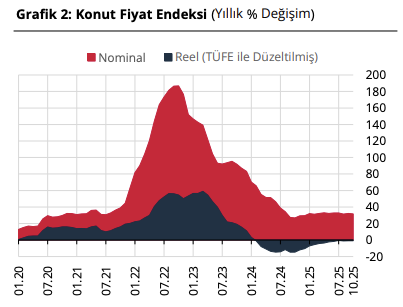 1️⃣ TCMB’den gayrimenkul sektörüne ilişkin takip ettiğimiz Konut Fiyat Endeksi (KFE) ve Ticari Gayrimenkul Fiyat Endeksi (TGFE) verilerini aldık. Konut fiyatlarına ilişkin veriler aylık, ticari gayrimenkul fiyat endeksine ilişkin veriler ise çeyreklik yayınlanıyor. Ekim ayında Konut Fiyat Endeksi (KFE) aylık bazda %1,6 artarak 198,8 seviyesine yükselirken, yıllık artış %31,6 oldu. Reel olarak ise konut fiyatlarında %1’lik düşüş kaydedildi. Reel fiyat düşüş serisi 21’nci aya ulaştı. Yıllık değişimde ise Ankara %38,4 ile en yüksek artışı gösterirken, İstanbul %32,4 ve İzmir %30,7 seviyelerinde arttı. Ticari Gayrimenkul Fiyat Endeksi (TGFE) 2025’in üçüncü çeyreğinde bir önceki çeyreğe göre %5,3 artarak yıllık bazda %30 yükseldi ancak reel olarak %2,4 geriledi. Böylece ikinci çeyrekteki %6,9’luk çeyreklik artışa kıyasla momentumun bir miktar zayıfladığı görüldü. Üçüncü çeyrekte dükkan fiyatları çeyreklik bazda %5,2 artarken ofis fiyatlarındaki artış %5,9 oldu.