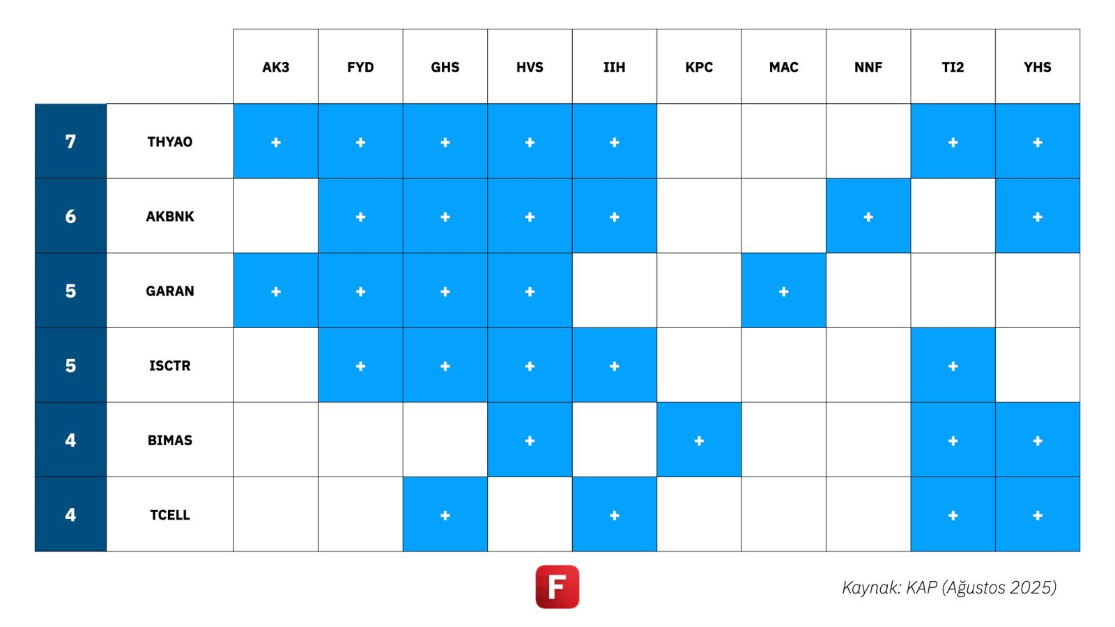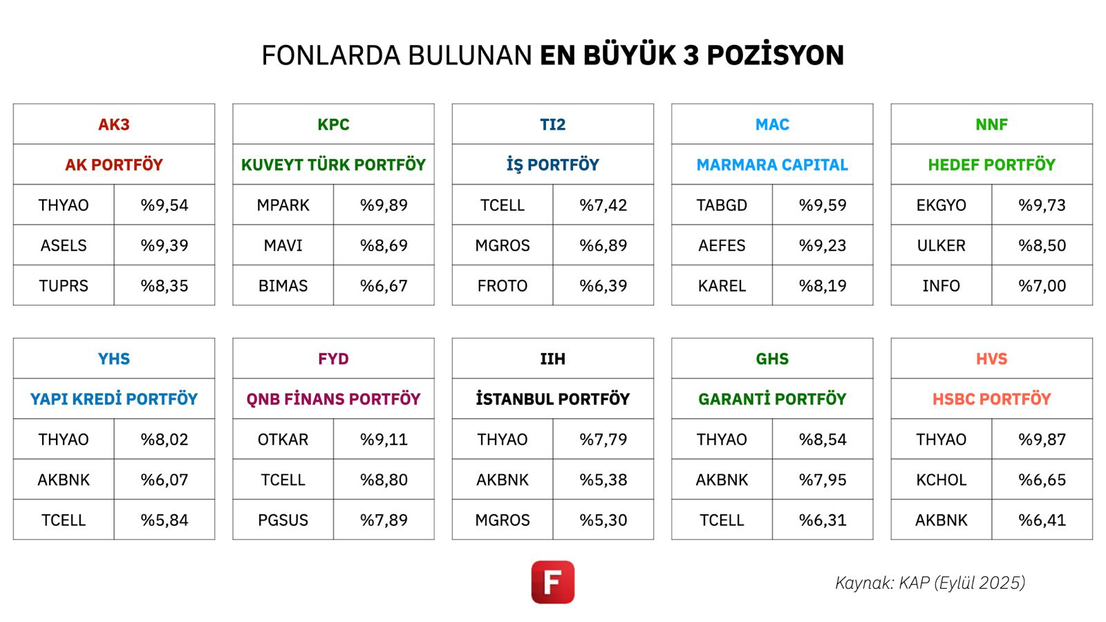 Bültenimizde yer verdiğimiz yatırım fonlarının ortak tuttuğu hisseleri 2 kritere göre seçtik. Bunlardan ilki, ağırlığın %4’ten fazla ortak olarak bulunması. Diğeri ise en az 4 fonda yer alması.