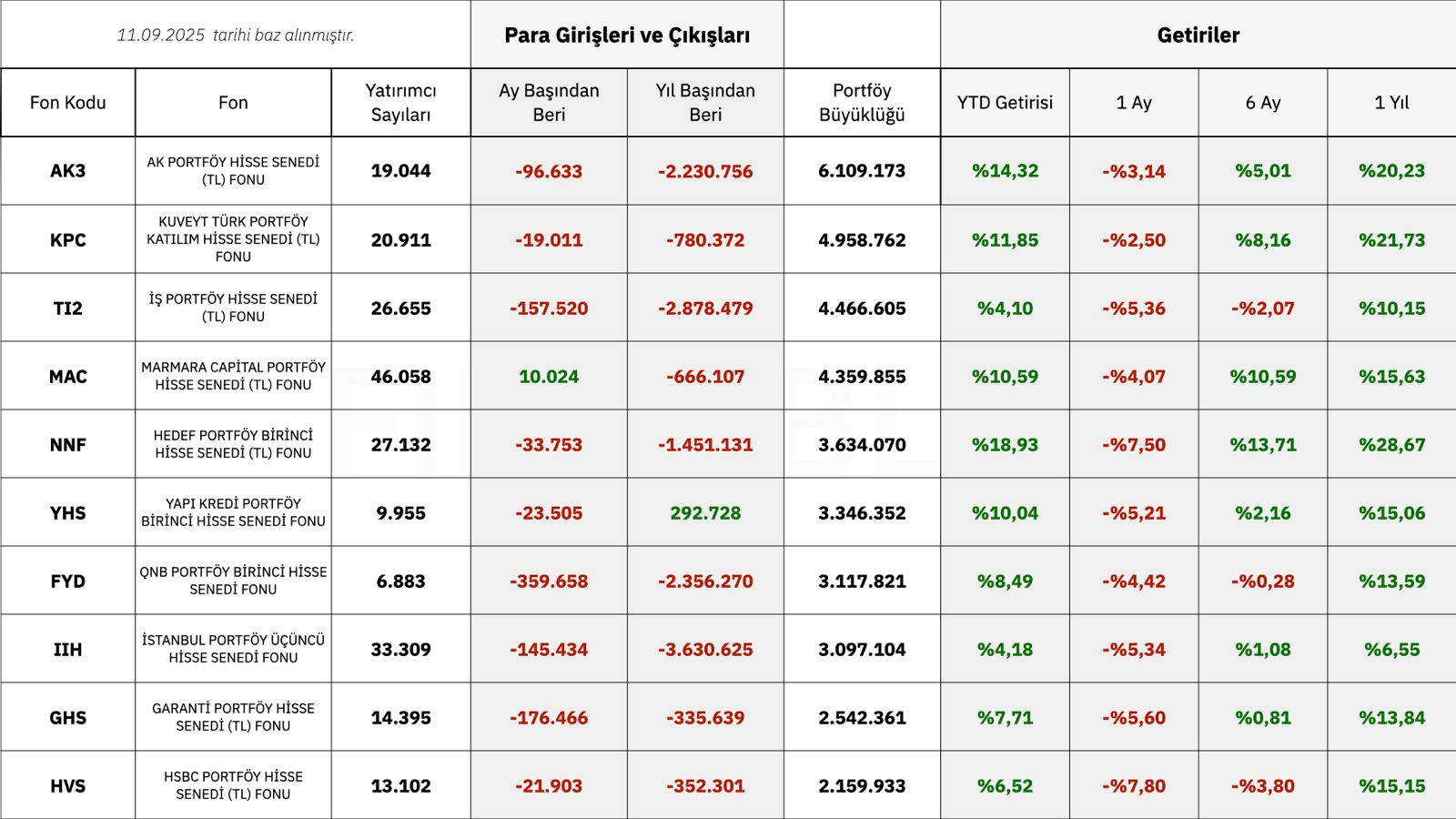 Kriterlerden ilki, TEFAS’ta işlem görüp her ay portföy dağılımını KAP’a bildirmesi. İkinci kriterimiz yalnızca belirli bir temaya yatırım yapmaması. Son kriterimiz ise toplam portföy büyüklüğü bakımından en yüksek ilk 10 fon içinde olması. Bu fonları büyükten küçüğe göre sıralarken; yatırımcı sayılarına, yılbaşından bu yana olan getirilerine ve para girişlerine göre sınıflandıralım istedik: