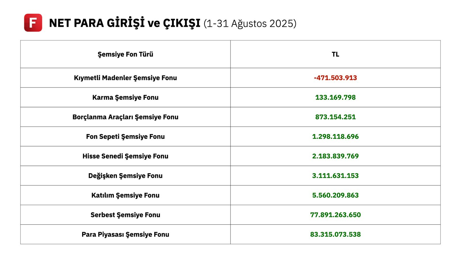 Ağustos ayında para piyasası fonlarına olan girişler 83 milyar TL seviyesinde devam etti. Buna karşın, Serbest Para Piyasası fonlarından 42 milyar TL’lik çıkış gerçekleşti. Dip toplama bakıldığında ise nette fonlara para girişlerinin sürdüğü görülüyor.
