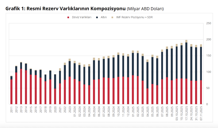 Aynı hafta yurt içi yerleşiklerin döviz talebi azalırken, altına yönelim belirginleşti. Parite etkisinden arındırılmış DTH’lar 1,3 milyar dolar gerilerken, bunun yaklaşık 900 milyon doları kurumların, 380 milyon doları ise hanehalkının çözülmesinden kaynaklandı. Buna karşılık kıymetli maden hesaplarında 664 milyon dolarlık artış gerçekleşti. Hanehalkı talebi yine ağırlığı oluşturdu. TCMB tarafında ise rezerv birikimi sürdü. Net rezervler 3,9 milyar dolar artarak 73,1 milyar dolara, brüt rezervler ise 185,1 milyar dolara çıktı. Swap stoku 1,7 milyar dolar azalsa da swap hariç net rezervler sınırlı da olsa artış göstererek 58,2 milyar dolara ulaştı. Haftalık veriler, kasımın ilk haftasında hem yabancı akımlarında hem rezerv birikiminde olumlu seyrin korunduğuna işaret ediyor.