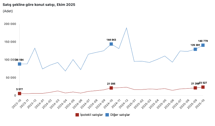 Diğer satış türlerinde ve ilk el konutlarda ise yıllık bazda sınırlı gerileme dikkat çekti. Ekim ayında ilk el satışlar %4,9 düşerek 55 bin adet seviyesine gerilerken, ikinci el konut satışları %1,8 artışla 109 bin adedi geçti ve toplam satışların üçte ikisini oluşturdu. İlk 10 aylık tablo ise daha dengeli bir görünüme işaret ediyor. İlk el satışlarda %11’e yakın artış, ikinci elde ise %19’a yaklaşan yükseliş devam ediyor. Veriler, dönemsel dalgalanmalara rağmen konut talebinin yıl genelinde güçlü seyrettiğini, özellikle ikinci el piyasasının toplam hacmi sürüklemeyi sürdürdüğünü gösteriyor.