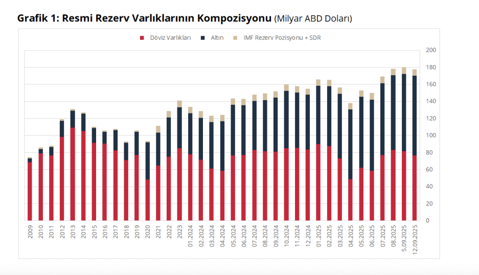 12 Eylül haftası verilerine göre TCMB rezervlerinde gerileme görüyoruz. Net döviz rezervi 1,6 milyar dolar düşüşle 69,5 milyar dolara, brüt rezerv ise 2,2 milyar dolar azalışla 178 milyar dolara indi. Swap stoku bu dönemde 865 milyon dolar artarak 17,8 milyar dolara yükseldi. Swap hariç net rezerve baktığımızda 2,5 milyar dolar düşüşle 51,8 milyar dolara gerilediğini görüyoruz. Hatırlatalım, 19 Mart öncesinde swap hariç net rezervler 65 milyar dolar seviyesinde bulunuyordu.