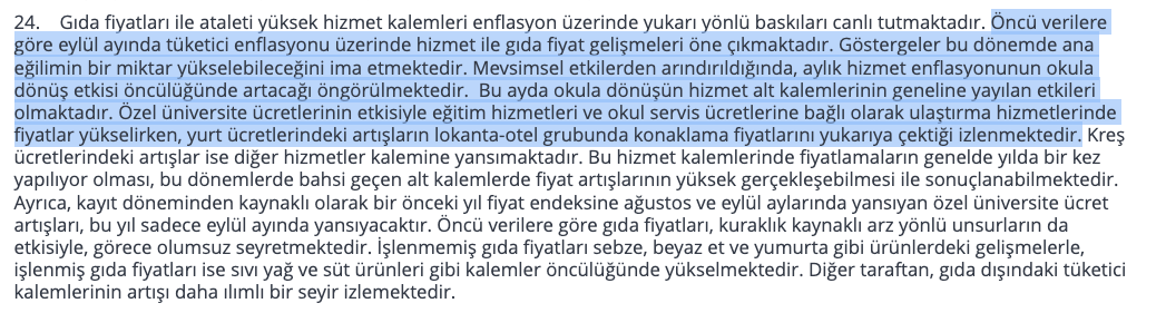 ☑ PPK özetinde eylül ayı için özellikle hizmet ve gıda kaynaklı fiyat baskılarının enflasyonun ana eğiliminde yeniden yukarı yönlü risk yarattığı vurgulanıyor.