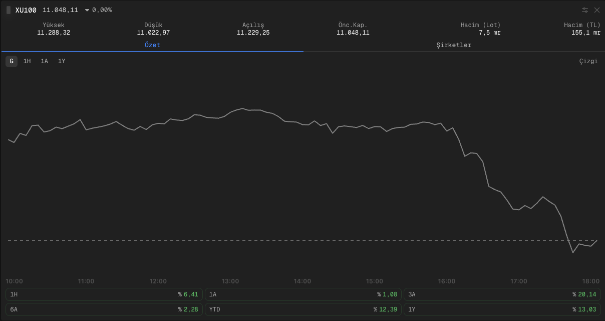 BIST 100 endeksi günü yüzde 1,05 düşüşle 11.048 puandan tamamladı. İşlem hacmi 155 milyar lirayı bulurken, satışların merkezinde bankacılık hisseleri vardı. Bankacılık endeksi yüzde 2,98 değer kaybetti ve endeksteki düşüşün ana nedeni oldu. Holdinglerde kayıp sınırlı kalsa da sanayi tarafında da iştah zayıftı. Dün aldığımız TCMB verilerine göre yabancılar 12 Eylül haftasında hisse senetlerinde 164,9 milyon dolar satış yaparken, son 6 haftalık dönemde toplam yabancı çıkışı 535 milyon dolara ulaştı.