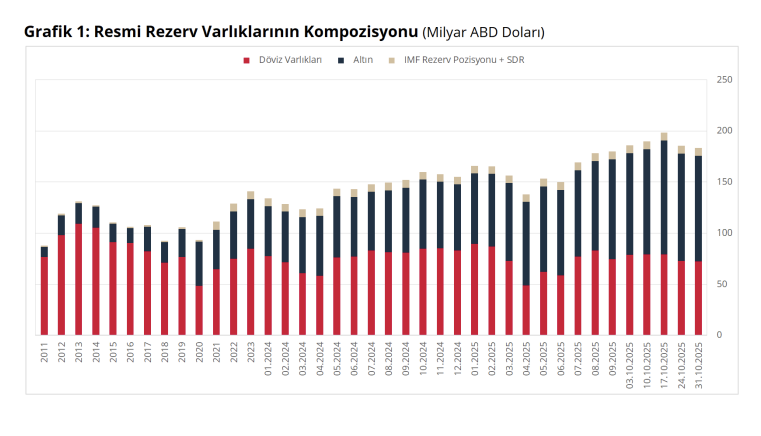 Aynı hafta içinde yurt içi yerleşiklerin altın hariç döviz tevdiat hesapları (DTH) 130 milyon dolar, altın dahil toplam DTH’ları ise fiyat etkisinden arındırılmış olarak 800 milyon dolar arttı. TCMB’nin verilerine göre net döviz rezervi 1,5 milyar dolar artışla 69,2 milyar dolara, swap hariç net rezerv ise 52,5 milyar dolara yükselirken, brüt rezerv 183,6 milyar dolara geriledi. Swap stoku ise 16,7 milyar dolara çıktı.