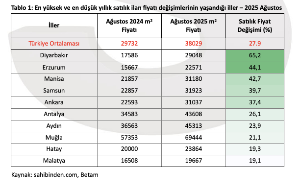 Satılık konut piyasası ise canlılığı gösteriyor. Talep endeksi ağustosta %5,6 artışla son iki yılın zirvesine çıkarken, reel fiyatlar büyük şehirlerin çoğunda geriledi. Ankara yine pozitif bölgede kaldı. Cari fiyatlarda yıllık artış %27,9’a ulaştı. En hızlı yükseliş Diyarbakır ve Erzurum gibi Anadolu illerinde görüldü. Buna karşılık birçok büyükşehirde artış oranları enflasyonun altında kaldı. Satış ilanlarının yayında kalma süresi ise ortalama 58,5 güne çıkarak işlem süresinin uzadığına işaret ediyor.