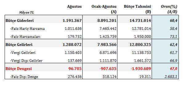 ☑ Merkezi bütçe ağustosta uzun zaman sonra fazla verirken; gelirlerdeki güçlü artış faiz giderlerini baskıladı.