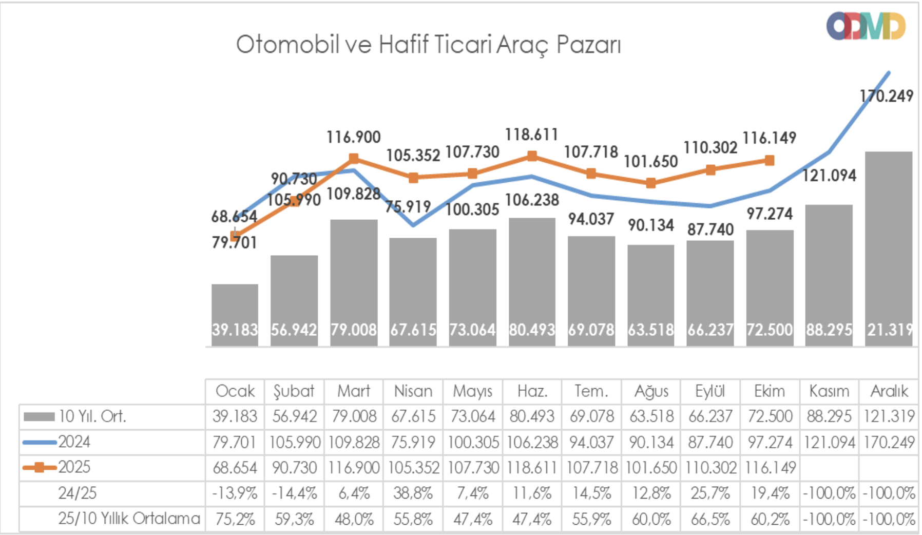 Otomotiv pazarı güçlü seyrini sürdürüyor. Otomotiv Distribütörleri ve Mobilite Derneği (ODMD) verilerine göre, otomobil ve hafif ticari araç satışları yıllık %19,4 artışla 116 bin 149 adede yükseldi. Böylece pazar 2025 yılında, zayıf kredi koşullarına ve yüksek faiz ortamına rağmen 10 ayda 1 milyon barajını aşarak 1 milyon 43 bin 796 oldu. Binek araç satışları %19,9 artışla 90 bin 695, hafif ticari satışları ise %17,8 artışla 25 bin 454 adet oldu. Elektrikli araçlar pazar payını %17,8’e çıkararak hızlı büyümesini sürdürürken, hibrit modellerin payı %26,4’e yükseldi. Benzinli otomobiller halen %47 payla pazarın en büyük segmenti konumunda.