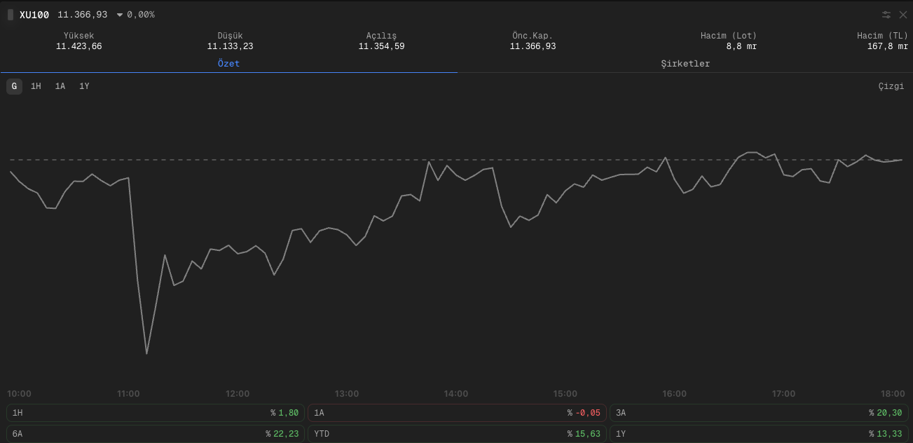 Borsa İstanbul dün dalgalı bir günü geride bıraktı. Sabah saatlerinde CHP İstanbul İl Başkanlığı Olağanüstü Kongresi’ne dair mahkeme kararının yarattığı belirsizlik endeksi sert şekilde aşağı çekti, kayıplar yüzde %2’ye yaklaştı. Ancak YSK Başkanı Yener’in sürecin devam edeceğini açıklamasıyla baskı kısa sürede dağıldı ve gelen alımlarla kayıplar geri alındı. Gün sonunda BIST 100 endeksi yüzde 0,31 yükselerek 11.366 puana yerleşti.