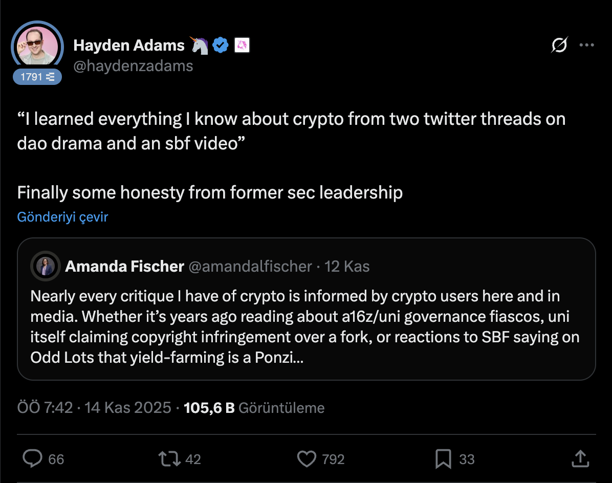 🦄 Uniswap kurucusu Hayden Adams, eski SEC yöneticilerinin kriptoyu yüzeysel bilgilerle değerlendirdiğini ima eden paylaşımıyla gündeme geldi. Adams, “eski SEC liderliğinden nihayet biraz dürüstlük” diyerek eleştirilerini alaycı bir dille dile getirdi.