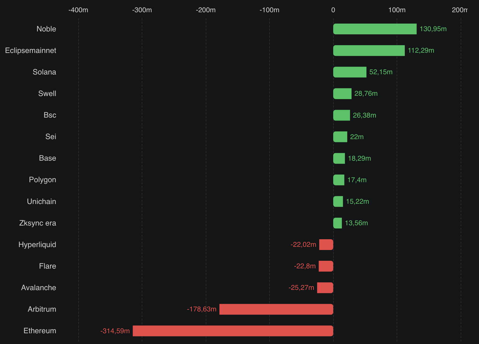 Bu hafta liste başında görmeye alışık olmadığımız Noble ağına $130 milyonluk giriş olurken Ethereum’da ise $314 milyonluk varlık çıkışı yaşandı.