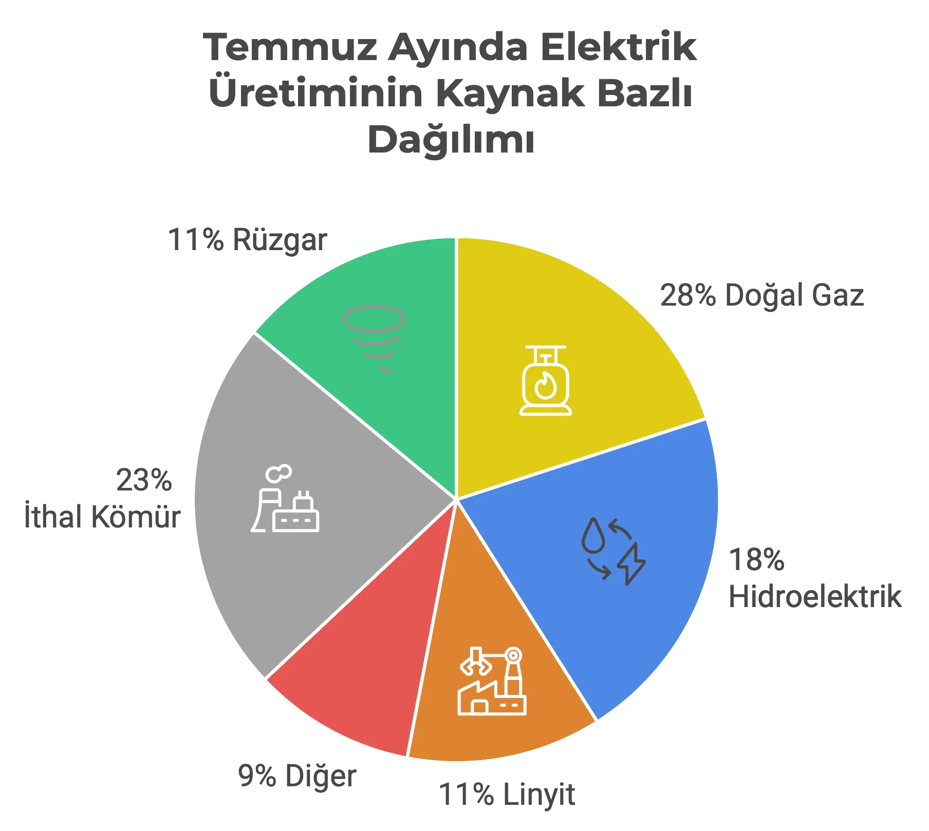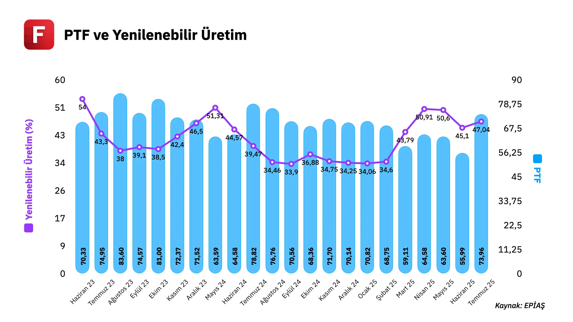 ✦ Temmuz ayında elektrik üretimine en büyük katkıyı %28 ile doğal gaz santralleri sağladı. Yenilenebilir enerjinin toplam üretimdeki payı geçen yılki %49,47’lik seviyesinden mevcut dönemde %47,04’e geriledi. Söz konusu düşüşte, hidroelektrik santrallerinin %19,82’den %18,04’e ve rüzgar santrallerinin %13,04’ten %11,33’e gerilemesi etkili oldu. Öte yandan yerli kömür santrallerinin toplam üretimdeki payı %14’ten %12’ye gerilerken ithal kömür santrallerinin payı %22’den %23’e, lisanslı güneş santrallerinin payı %2’den %3’e çıktı.
