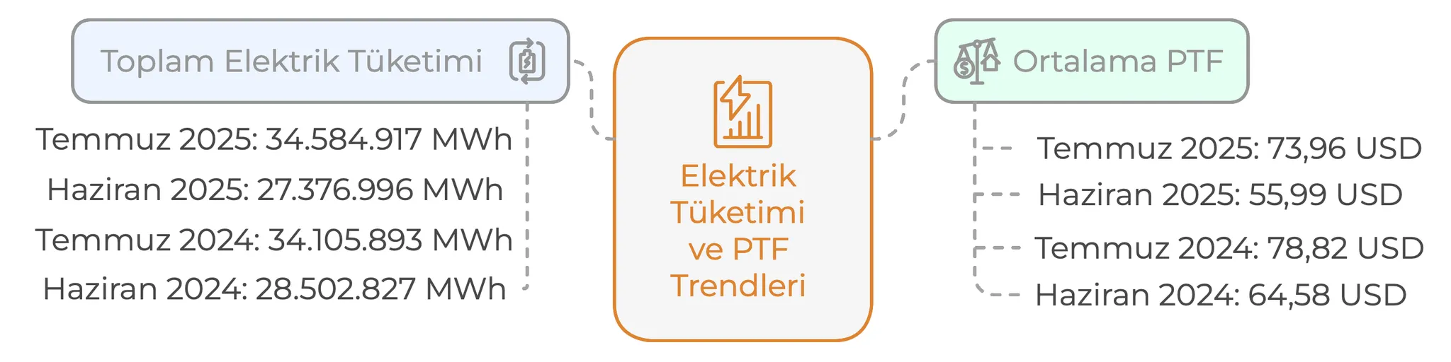 ✦ Tüketimdeki güçlü artışa bağlı olarak ortalama piyasa takas fiyatları (PTF) temmuz ayında aylık bazda kayda değer bir yükseliş gösterdi. Ancak dolar bazında değerlendirildiğinde, fiyatlar hâlâ geçen yılın altında seyretmeye devam ediyor. Temmuz ayında ortalama PTF 73,96 USD ile son 11 ayın en yüksek seviyesine ulaşırken, yıllık bazda %6 düşüş gösterdi; aylık bazda ise %32 oranında artış kaydetti.