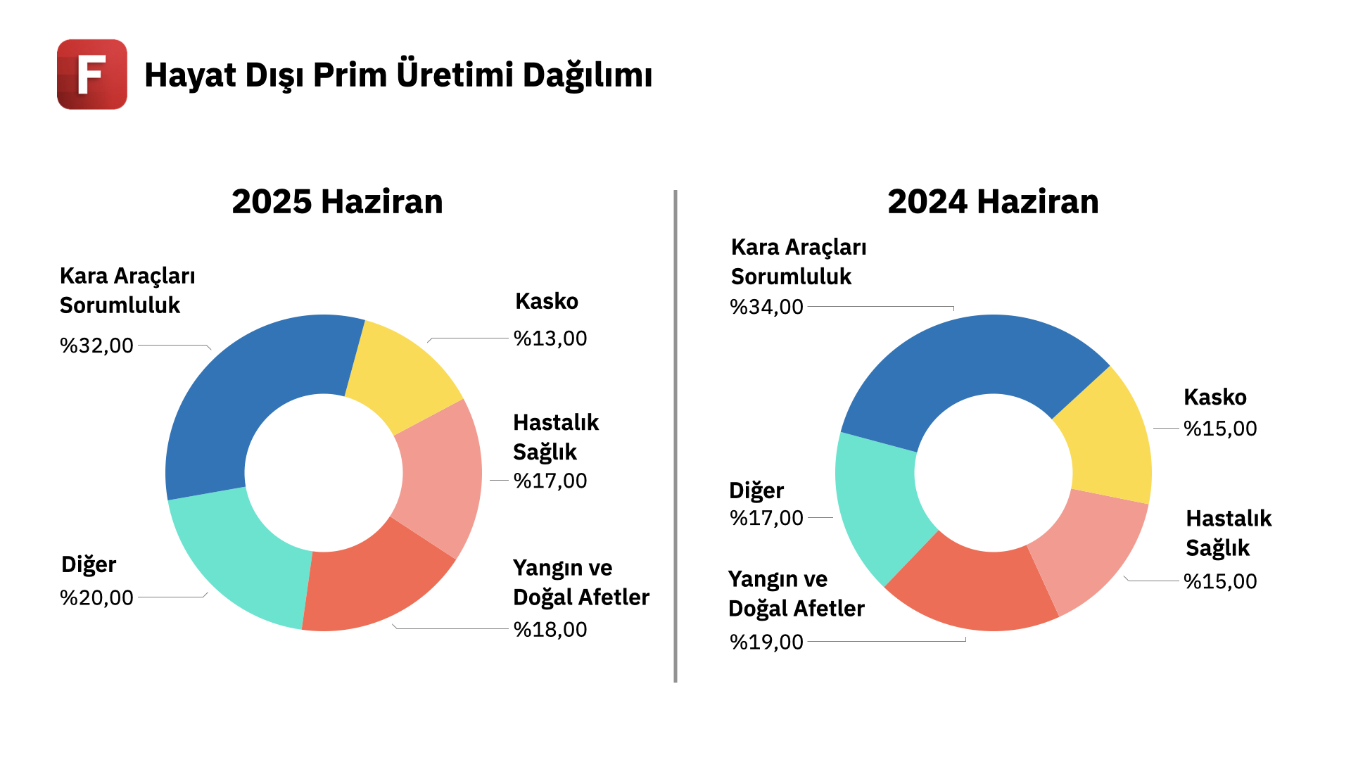 ✧ Haziran ayında toplam prim üretiminde en fazla payı olan ilk 3 branş; kara araçları sorumluluk, yangın ve doğal afetler ile hastalık-sağlık olurken bu branşlardaki yıllık büyüme oranları da sırasıyla %37, %38 ve %70 olarak kaydedildi.