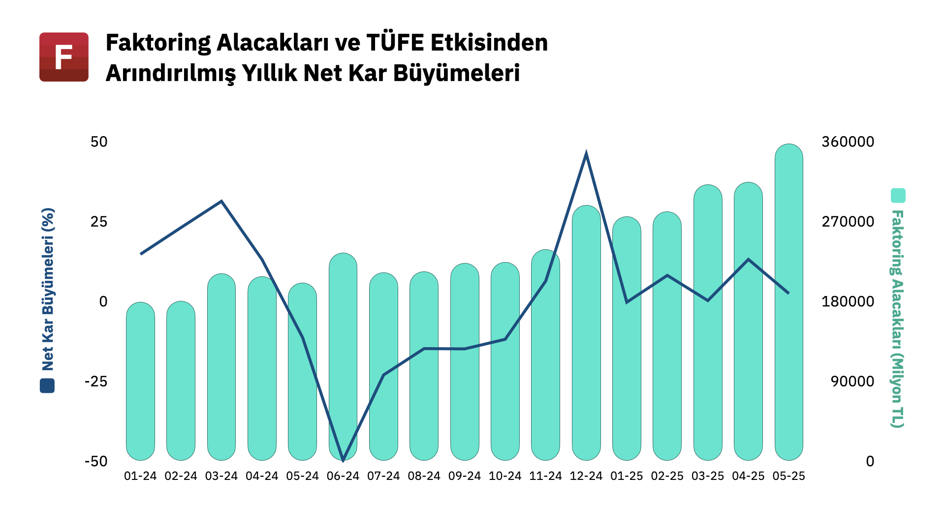 ✦ Faktoring sektörünün net karlarındaki yıllık reel büyümeler devam ediyor. BDDK verilerine göre, sektörün haziran ayı kârı 2,3 milyar TL ile geçen yılın aynı dönemine göre %41 artış kaydederken bir önceki aya kıyasla %17 geriledi. Toplam alacak tutarı mayıs ayına göre %9 artışla 358 milyar TL’ye yükselirken aylık faktoring gelirleri ise yıllık bazda %45 oranında artış gösterdi.