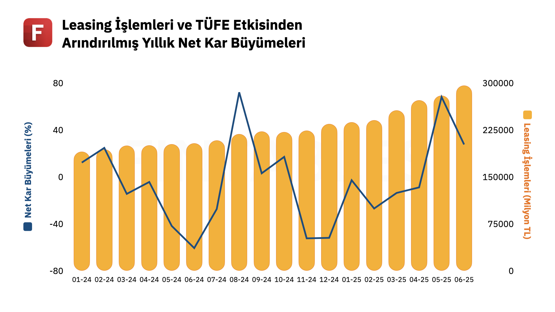 ✦ Finansal kiralama sektöründe ise net karlar son 2 aydır güçlü bir büyüme performansı sergiliyor. Sektörün haziran ayındaki net karı 2.474 milyar TL ile yıllık bazda %76 oranında artarken mayıs ayındaki rekor büyüklüğe kıyasla %11 azaldı. Net kiralama işlemleri bir önceki aya göre %6 artarak 295 milyon TL’nin üzerine çıkarken aylık leasing gelirleri de yıllık bazda %18 oranında yükseldi.