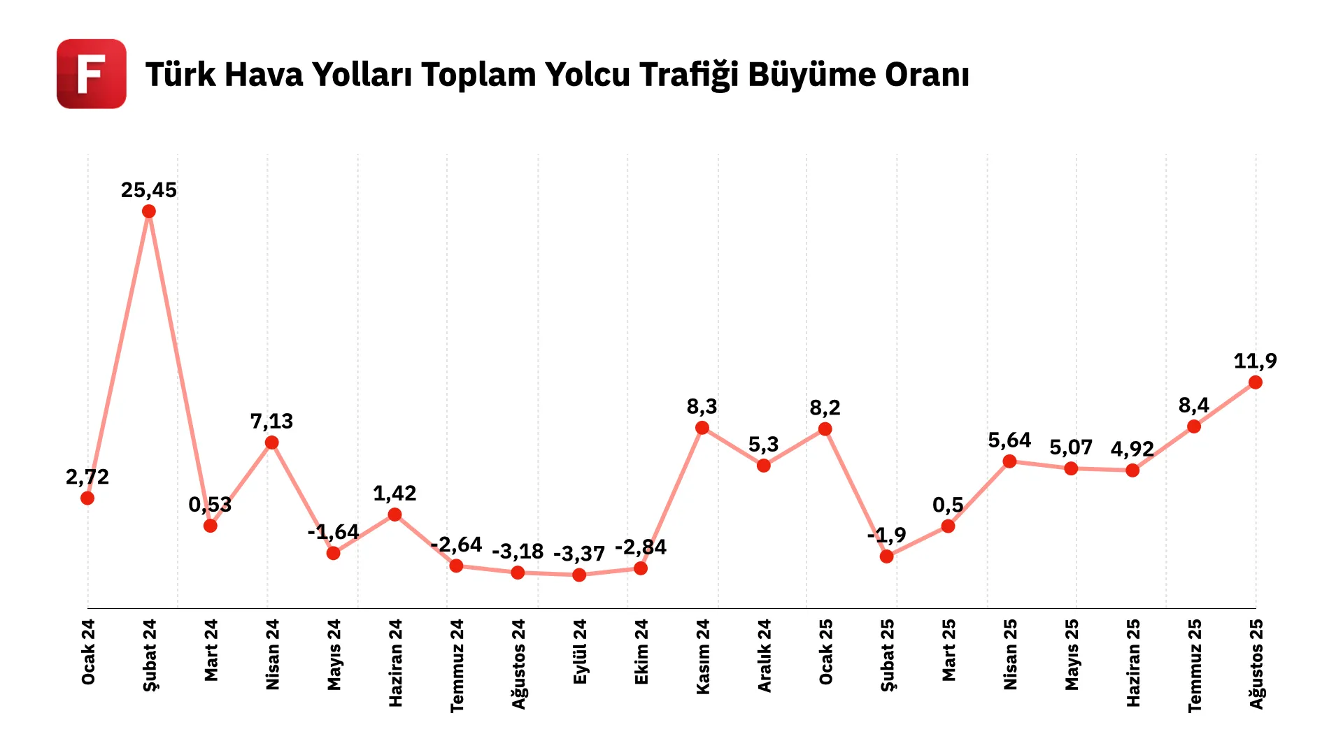 ✦ TAV Havalimanları’nın açıkladığı yatırımcı bültenine göre ağustos ayında hizmet verilen toplam yolcu sayısı 14 milyon olurken 2024’ün aynı dönemine kıyasla %8 büyüme gösterdi. Ağustos ayında uçuş sayısı 87 binin üzerine çıkarak geçtiğimiz senenin aynı ayına göre %7 artış gösterdi. Dış hatlardaki yolcu trafiği %5 büyürken iç hatlarda bu büyüme %12 oldu. Trafiğin en yüksek olduğu Antalya Havalimanı’nda geçen seneye göre büyüme %3 olurken; İzmir, Ankara ve Almatı Havalimanı’ndaki yolcu sayıları sırasıyla %19, %11 ve %4 arttı.