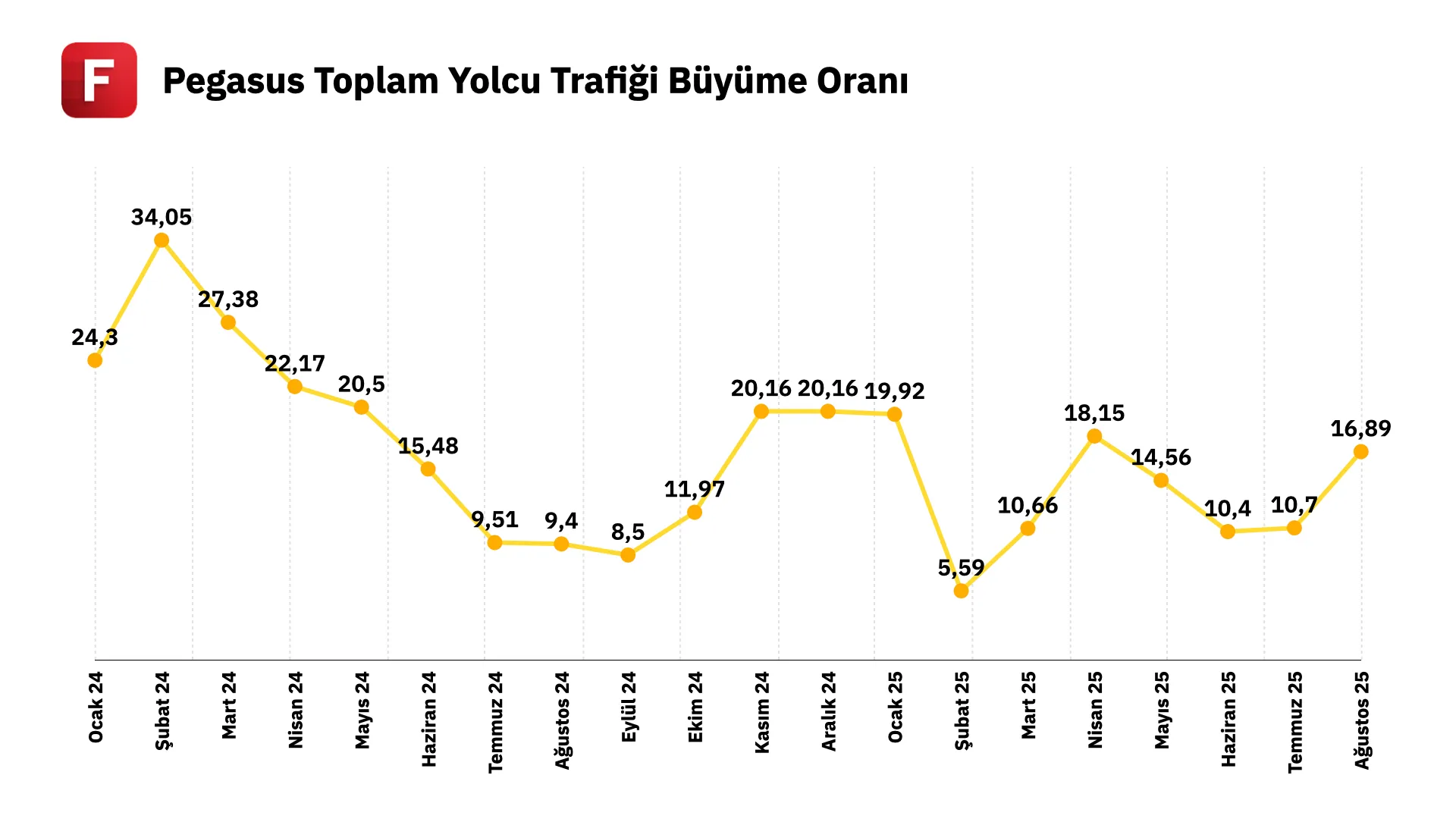 ✦ Aynı dönemde Pegasus’un toplam yolcu sayısı, önceki yılın %17 üzerinde 4,29 milyon kişiye ulaştı. Bunun alt kırılımlarından iç hatlardaki yolcu sayısındaki büyüme %17 olurken, dış hatlarda bu oran %16 oldu. Ağustos ayında şirket 22 bin 450 uçuş gerçekleştirerek yıllık bazda %15 büyürken bu uçuşlarda doluluk oranı %90,9 olarak ölçüldü. İç hatlardaki doluluk oranı %95,8 olurken dış hatlarda %88,4 oldu. Toplam arz edilen koltuk kilometre ise 7.642 milyon kilometre ile geçen yıla göre %17 arttı.