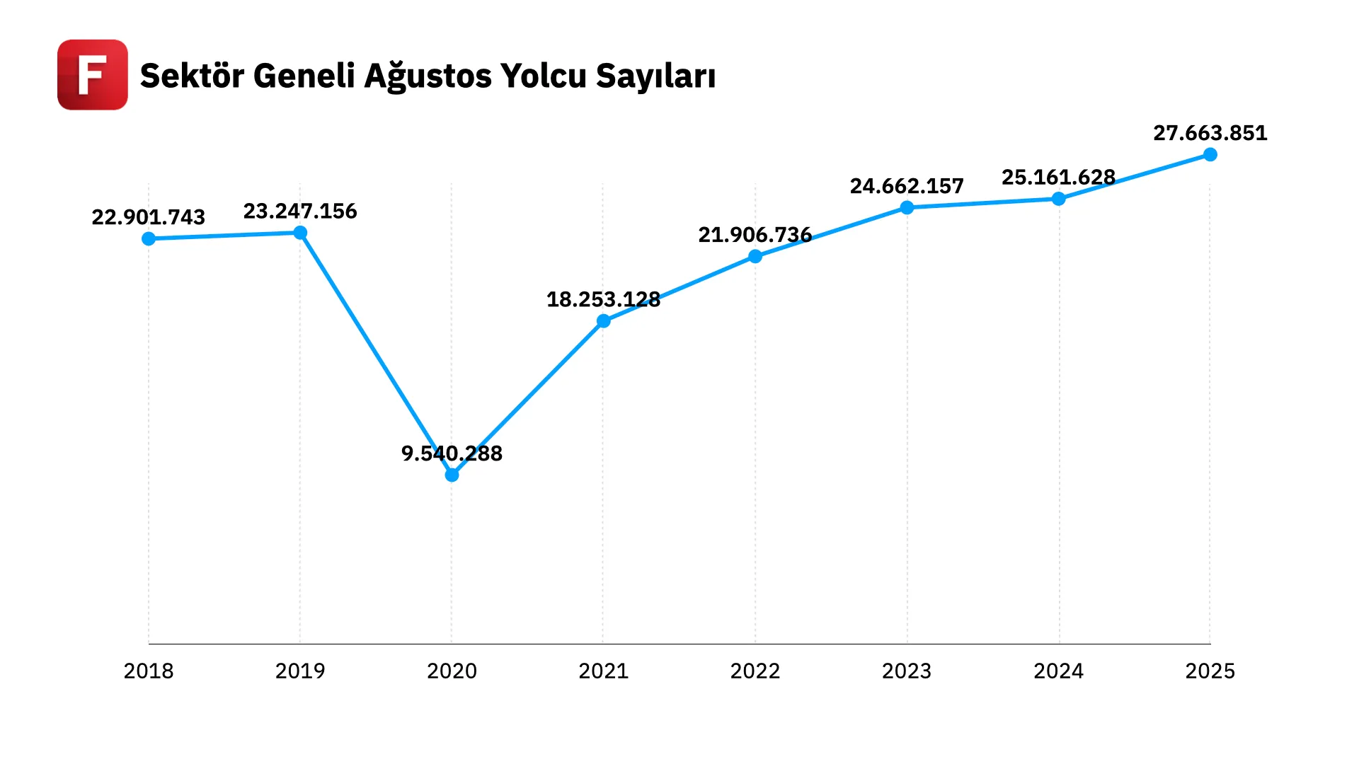 ✦ DHMİ verilerine göre, Türkiye’de toplam uçak trafiği ağustos ayında geçen yılın aynı dönemine göre %10,9 artış gösterdi. İç hatlar trafiği mevcut dönemde %15 yükselirken, dış hatlar trafiğinde bu oran %7,1 oldu. Aylık değişimlere baktığımızda toplam uçak trafiği %3 artarken iç hatlar %3,5 dış hatlar ise %2,6 yükseldi. Bunların yanında tüm uçak trafiğine en fazla katkı sağlayan 3 havalimanı sırasıyla %24,8 ile İstanbul Havalimanı, %16,2 ile Antalya Havalimanı ve %12,5 ile Sabiha Gökçen oldu. Öte yandan ağustos ayında toplam yolcu trafiği geçen seneye kıyasla iç hatlarda %14, dış hatlarda %7,4 ve toplamda ise %9,8 arttı.