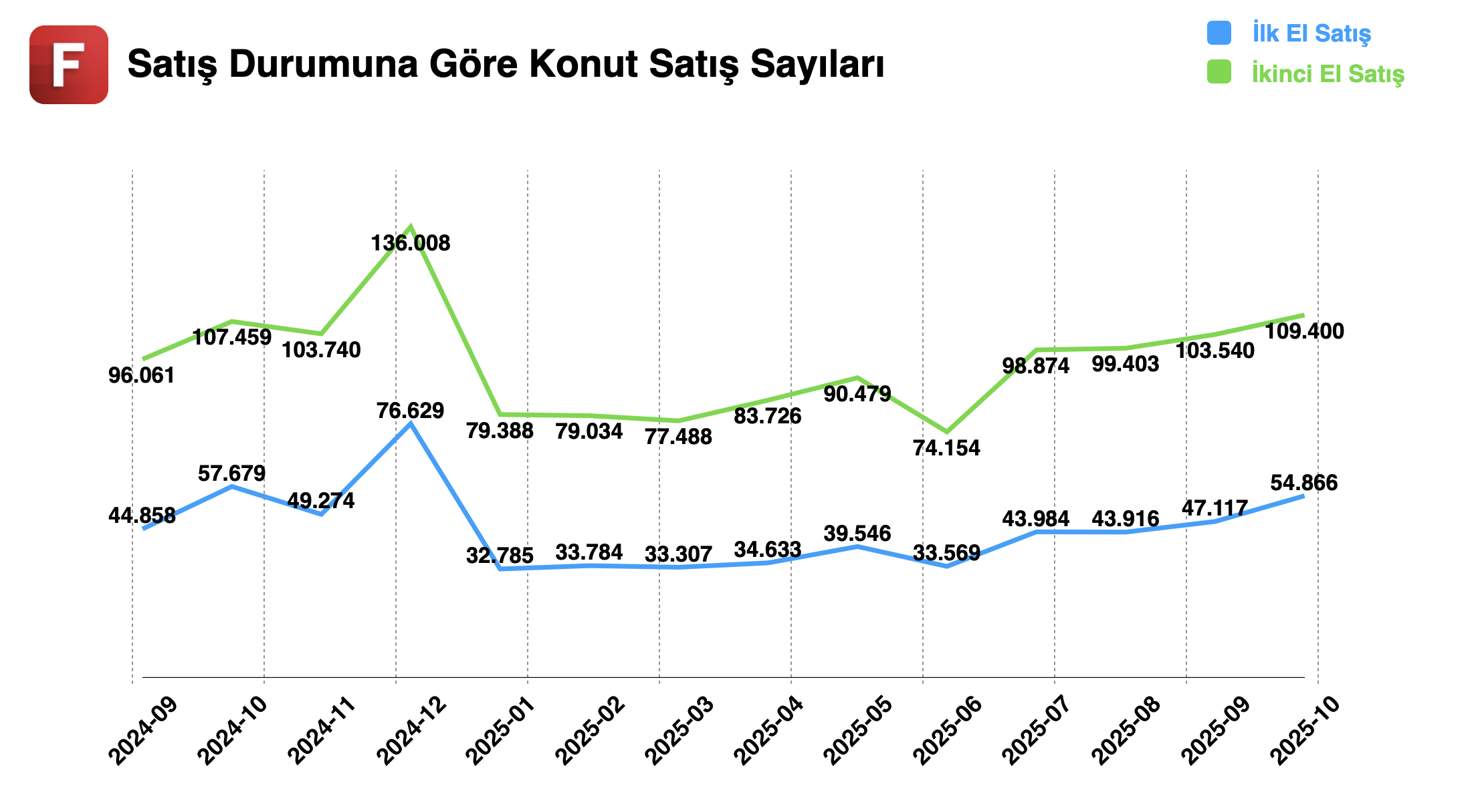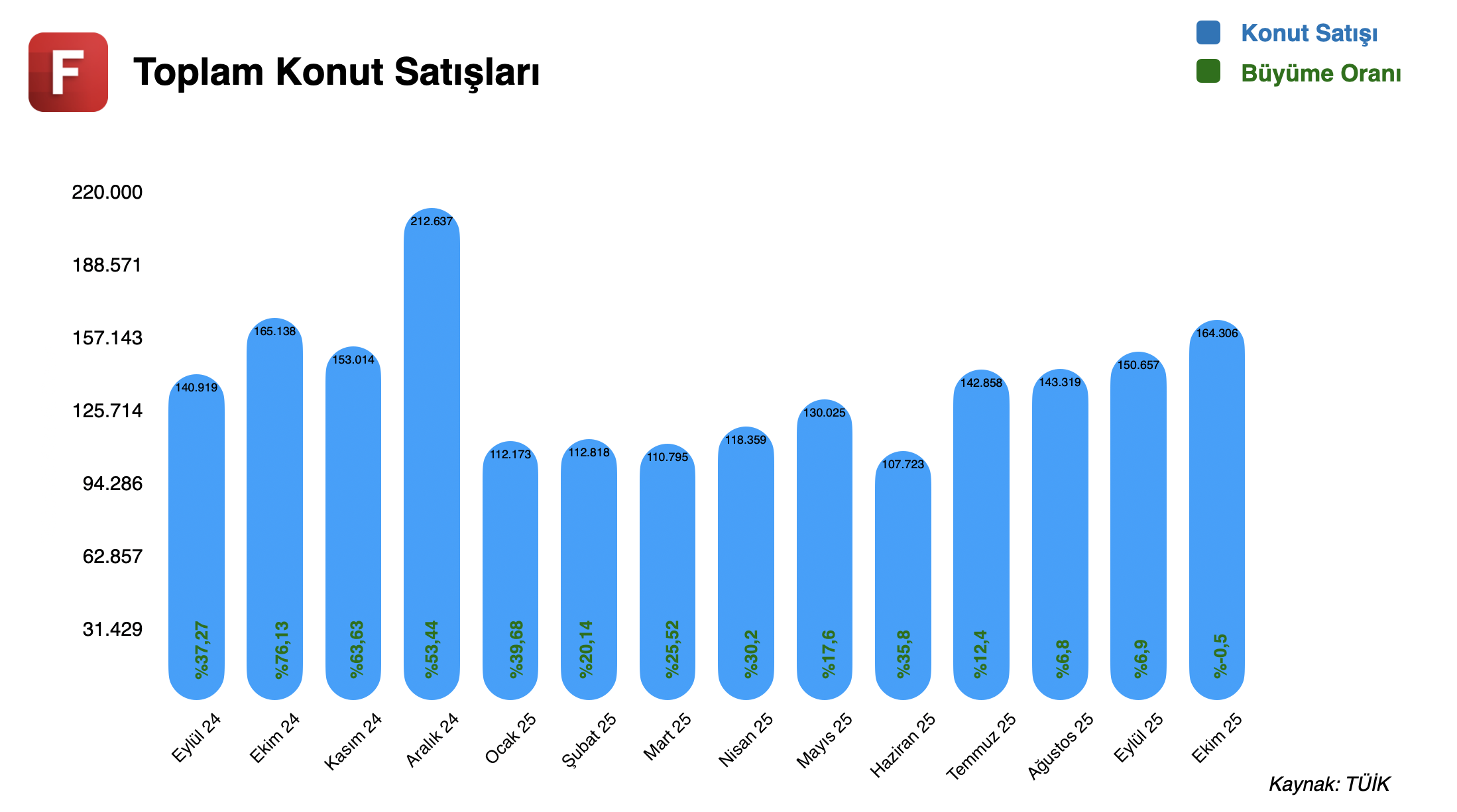 ✦ TÜİK verilerine göre, ekim ayında gerçekleştirilen konut satışları 164 bin 306 adet olarak gerçekleşti. Bu rakam, geçen yılın aynı ayına göre %0,5’lik sınırlı bir düşüşe işaret ederken, aylık bazda bakıldığında eylüle göre %9’luk bir artış kaydedildi. Böylece ocak–ekim döneminde toplam konut satışları geçen yılın aynı dönemine göre %16,2 artarak 1 milyon 293 bin adedin üzerine çıktı. Konut satışlarının en fazla olduğu iller sırasıyla 26 bin 305 adet ile İstanbul, 14 bin 861 adet ile Ankara ve 8 bin 678 adet ile İzmir oldu.