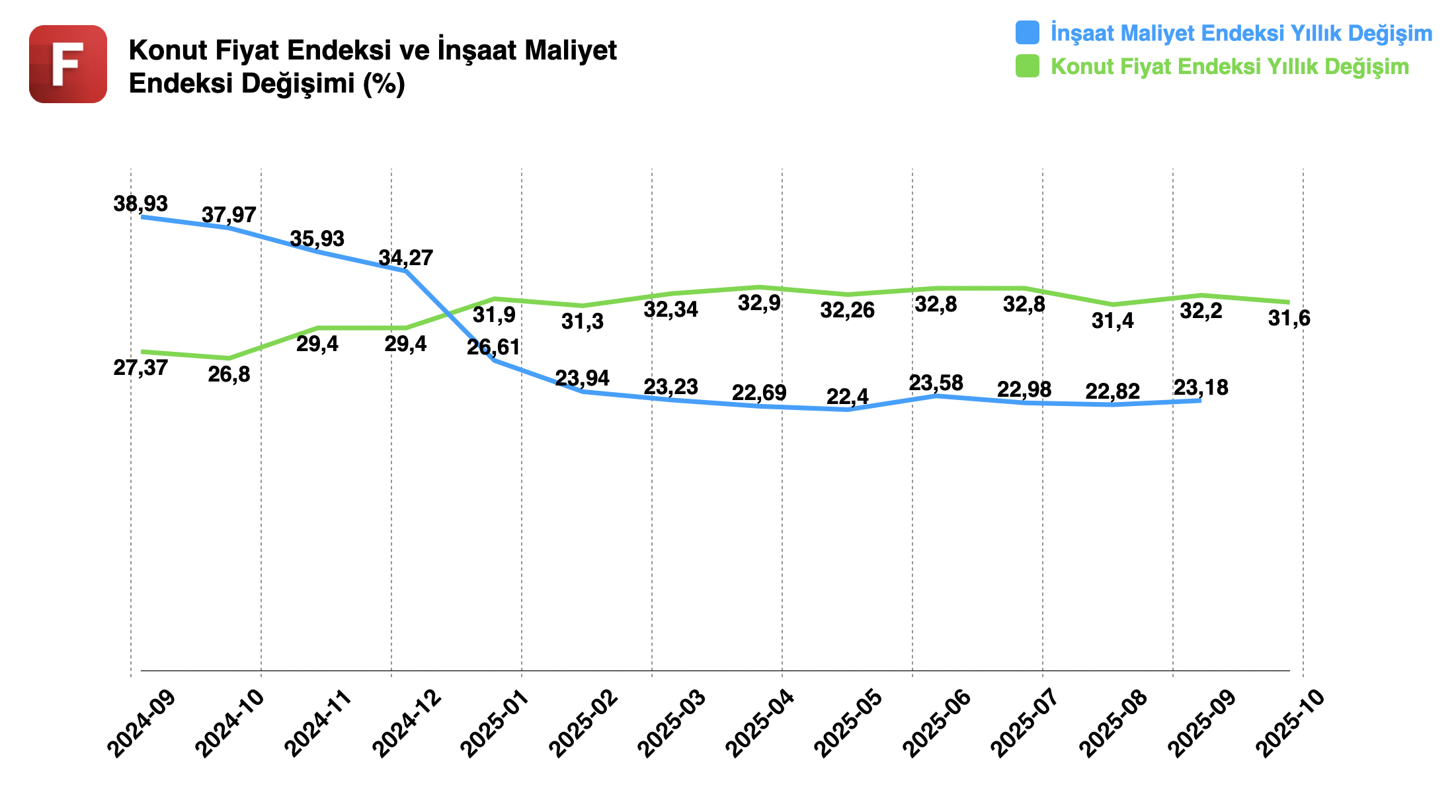 ✦ TCMB’nin açıkladığı Konut Fiyat Endeksi (KFE) verilerine göre, Ekim ayında Türkiye genelinde konut fiyatları aylık %1,6, yıllık ise %31,6 arttı. Ancak aynı dönemdeki tüketici enflasyonu dikkate alındığında, konut fiyatları reel olarak %1 oranında geriledi, yani nominal artış enflasyonun altında kaldı. Şehir bazında incelendiğinde İstanbul’da aylık fiyat artışı %2,7, Ankara’da %1, İzmir’de %1,8 düzeyinde gerçekleşti. Bu görünümle birlikte, İstanbul ve İzmir’de fiyatlar reel olarak düşmeye devam ederken, Ankara’da reel fiyat artışı sürdü.