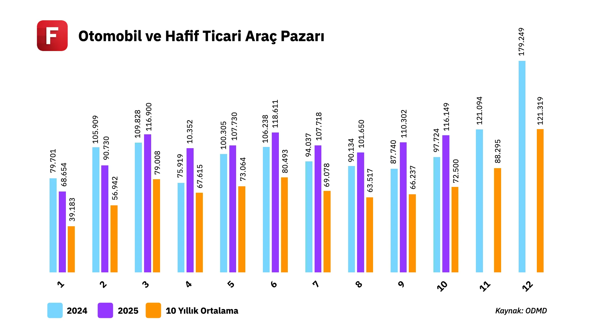 ✦ ODMD verilerine göre, ekim ayında otomotiv pazarı geçen yılın aynı dönemine kıyasla %19,4 artışla 116.149 adede ulaştı. Bu dönemde otomobil satışları %19,9 artışla 90.695 adet, hafif ticari araç satışları ise %17,8 artışla 25.454 adet olarak gerçekleşti. Böylece yılın ilk on ayında otomotiv pazarı, geçen yılın aynı dönemine göre %10,2 büyüyerek 1.043.796 adede ulaştı.