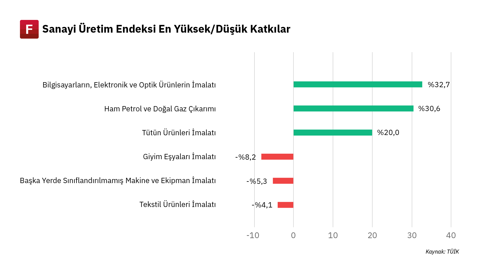 ✦ Türkiye İstatistik Kurumu’nun (TÜİK) açıkladığı verilere göre mayıs ayında sanayi üretimi yıllık ve aylık bazda toparlanma kaydetti. Mevsim ve takvim etkisinden arındırılmış endeks bir önceki aya göre %3,1 artarken, geçen seneye kıyasla %4,9 oranında yükseldi. Manşet veri güçlü bir görünüme işaret etse de detaylara bakıldığında bu artışın büyük ölçüde baz etkisinden kaynaklandığı görülüyor. ✧ Mart–Mayıs dönemini kapsayan üç aylık eğilimde yıllık büyüme %3,5’e yükselmiş durumda. Ancak aylık verilerin ortalaması, üretimdeki toparlanmanın halen zayıf olduğunu gösteriyor. Alt kırılımlarda sermaye malı üretimi %12’lik yıllık artışla öne çıkıyor ve bu kalem yatırım eğiliminde bir canlanma sinyali veriyor. Enerji üretimi %8,8 artışla güçlü bir performans sergilerken dayanıklı tüketim mallarında %1,7’lik yıllık daralma dikkat çekiyor. Bu segmentte hem iç hem de dış talepte zayıflık işaretleri öne çıkıyor. Tekstil ise üretim trendinde aşağı yönlü eğilimini sürdürüyor.
