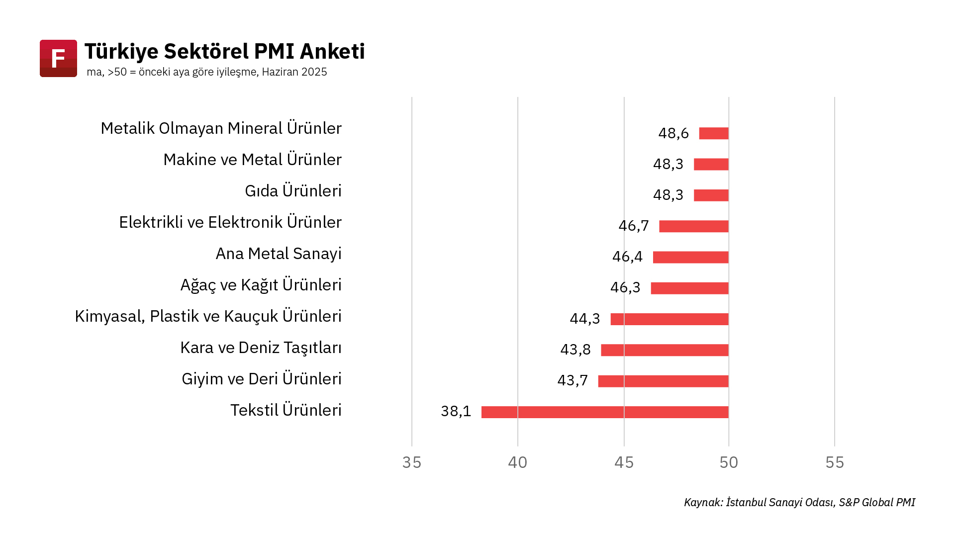 ✦ İstanbul Sanayi Odası’nın Türkiye İmalat PMI verisi, haziranda son sekiz ayın en düşük değerini alarak 46,7’ye geriledi ve 50 eşik değerinin altında 15. ay üst üste kalmış oldu. Yeni siparişler ve ihracat siparişlerindeki düşüş eğilimi ikinci yılına ulaşırken üretim hacmi Ekim 2024’ten bu yana en sert daralmayı kaydetti. İstihdam son dokuz ayın en yüksek oranında gerilerken satın alma faaliyetleri de Eylül 2024’ten bu yana en keskin yavaşlamayı yaşadı. Liranın değer kaybı ve İran’daki gelişmeler girdi maliyetlerinde artışı hızlandırsa da nihai ürün fiyatlarındaki artış hızı yılın en düşük seviyesine geriledi. Ayrıca, satışlardaki düşüşe bağlı olarak nihai ürün stokları son üç ayda ilk kez artış gösterdi.
