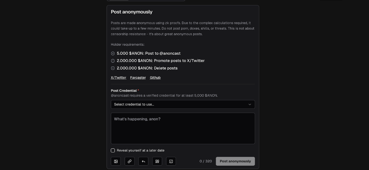 Anon, tamamen anonim bir sosyal platform ekosistemi yaratmak için Farcaster üzerine inşa edilmiş bir proje.