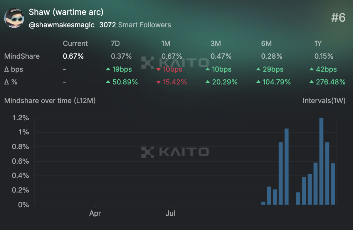 Aynı zamanda AI16Z Kurucusu Shaw, attığı tweetlerle ve toplulukla girdiği etkileşimlerle Kaito CT Leadership’inde 6. sırada.