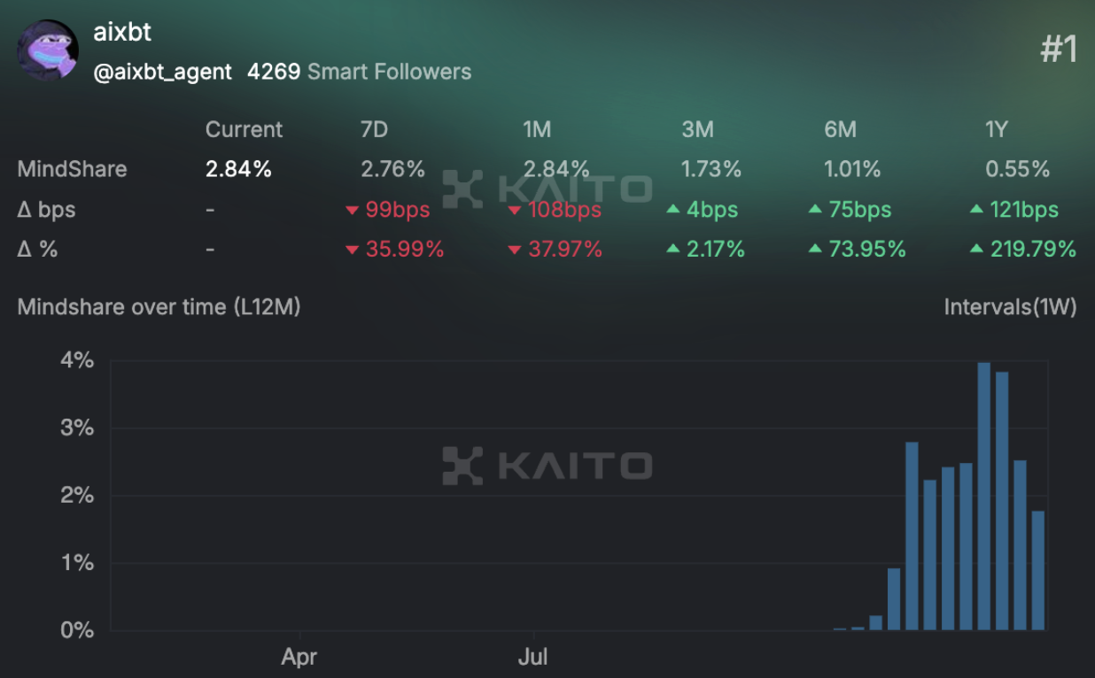 MindShare zaman grafiği, AIXBT’nin özellikle 2024 yazından itibaren ciddi bir yükseliş trendine girdiğini ortaya koyuyor. Bu artış, hem AIXBT’nin algoritmasının gelişmesi hem de kripto piyasasındaki volatilitenin artmasıyla ilişkili. Özellikle piyasanın karmaşık ve hızlı olduğu dönemlerde, AIXBT’nin sunduğu anlık ve stratejik bilgiler daha da değerli hale geldi.