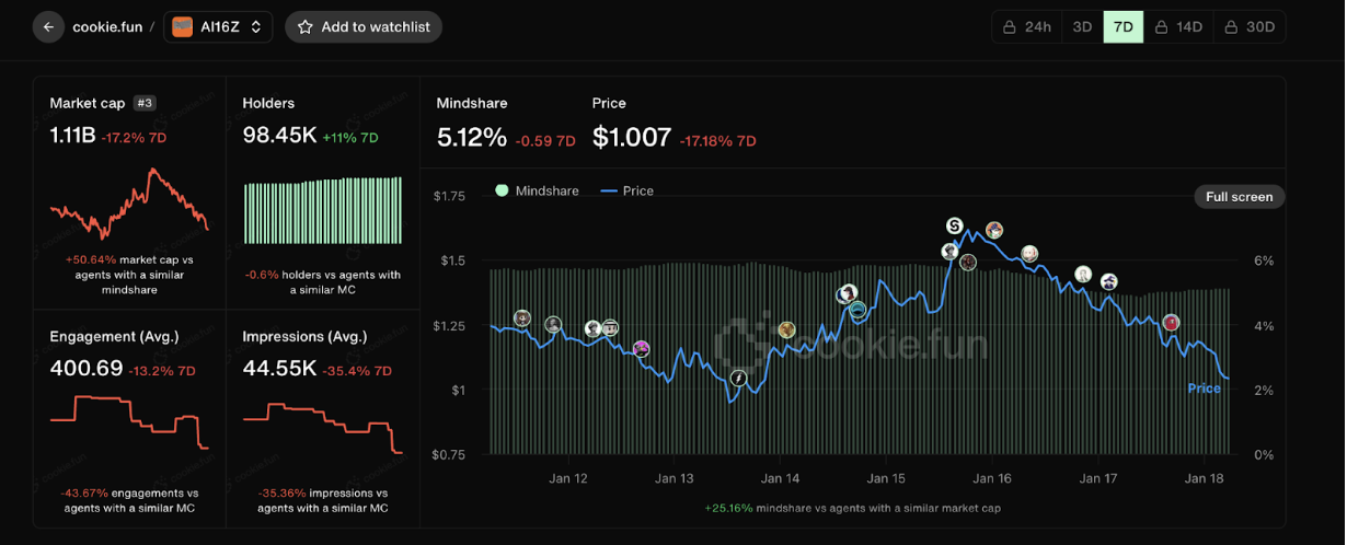4 ay gibi çok kısa bir sürede 1.11 Milyar piyasa değerine ulaşan AI16Z, 18 Ocak itibariyle $1.007 seviyesinde $ai16z token’a sahip.