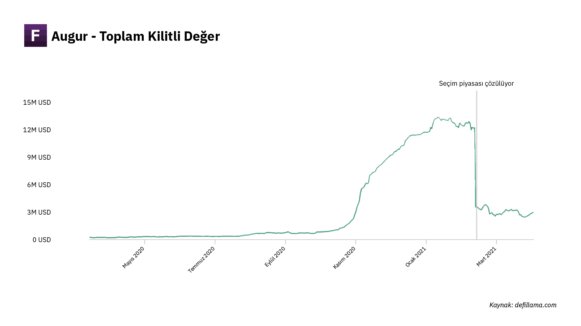 Augur TVL’inin seçimler öncesi yaşadığı birikme ve sonrasında dibe vuruşunu gösteren bir grafik.
