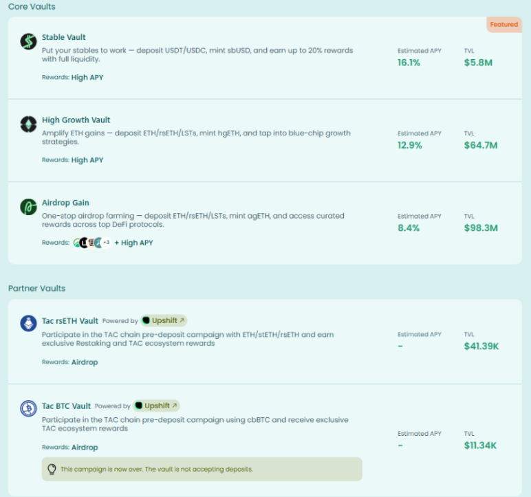 TAC henüz kendini ağını çıkarmadı. Ağ çıktığında likidite problemi yaşamamak için öncesinde likiditesini çeşitli kasalarda tutuyor ve ağ çıktığında bu likiditeyi doğrudan kendi zincirine geçirmeyi planlıyor. O zamana kadarsa likiditelsini Kelp’in kasalarında tutuyor. Buraya varlık yatıran kullanıcıların beklenti getirisi ise Tac’tan alacakları airdrop veya teşvikler. Teminat 2 farklı token ve bunların LST halleri için açılmış: BTC ve