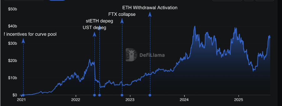 Ağutos 2025 itibariyle protokoldeki toplam kilitli değer, $32 milyar seviyelerinde.