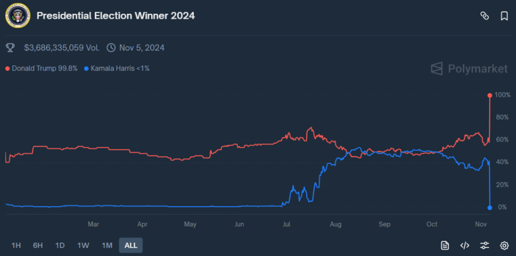 Tahmin piyasalara katılmak için sözleşme satın almanız gerekir, vadeli işlem piyasalarındaki opsiyonalr gibi düşünebilirsiniz. Çoğu finansal piyasada olduğu gibi, bir tahminin fiyatı insanların bu bahse ödemeye razı oldukları fiyata göre belirlenir. Doğal olarak, insanların ülkenin bir sonraki başkanına dair bir bahse, yerel futbol turnuvasının galibine kıyasla daha yüksek bir değer biçmesi beklenir. Örneğin 2024 yılında ABD’de gerçekleşen başkanlık seçimi tahmininin Polymarket’teki sözleşmesi: