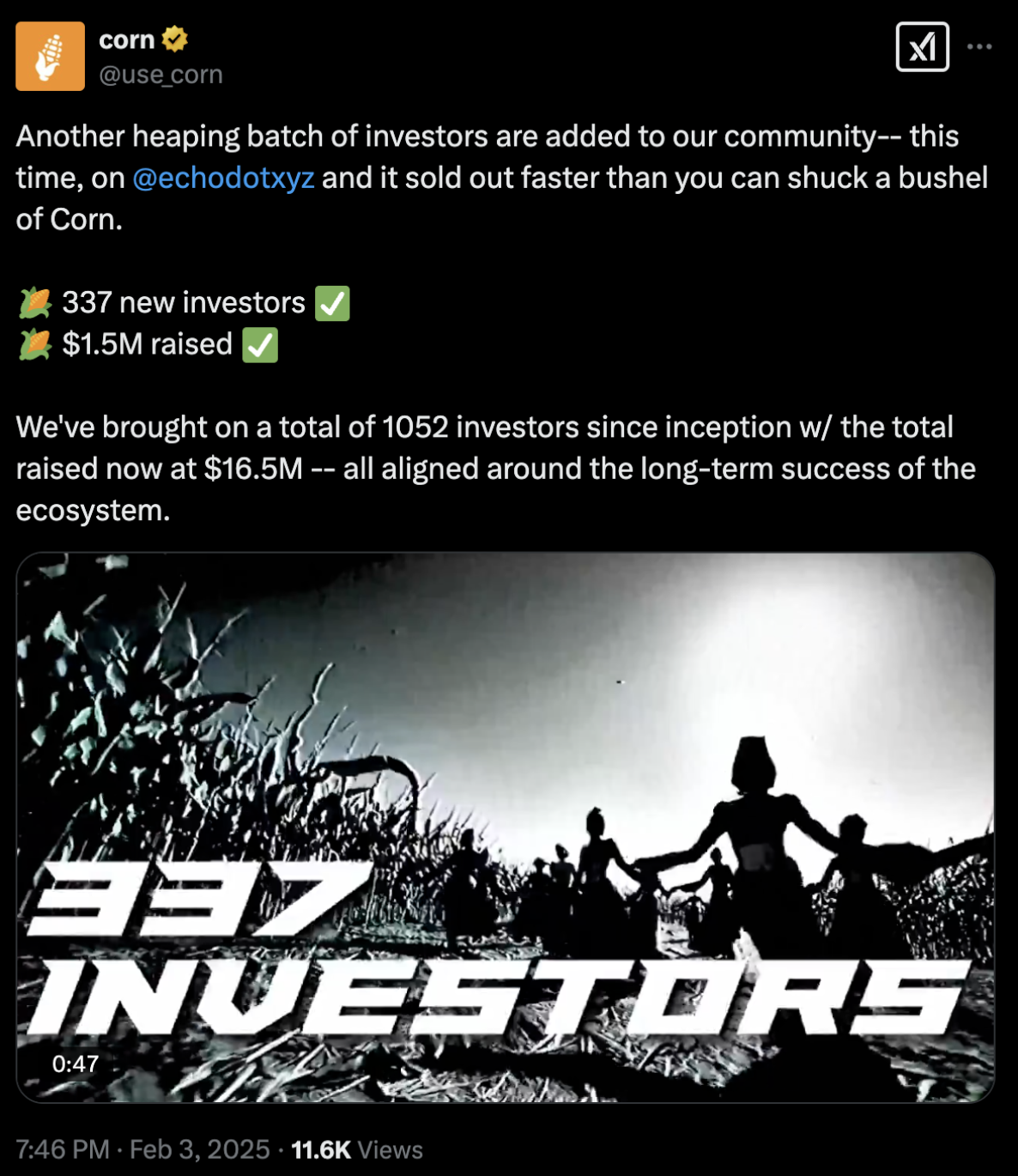 - Corn: Bitcoin destekli bir gas token kullanan Corn, Arbitrum’un altyapı desteğini, Bitcoin (Babylon ile entegre) ve Ethereum staking’i bir araya getirerek topluluğun dikkatini çeken projelerden biri haline geldi. Echo üzerinde düzenlenen topluluk yatırım turunda 337 yeni yatırımcıyı platformuna kazandıran Corn, sadece kısa bir sürede 1.5 milyon dolar fon toplamayı başardı ve ekosistemde kendine sağlam bir yer edindi.